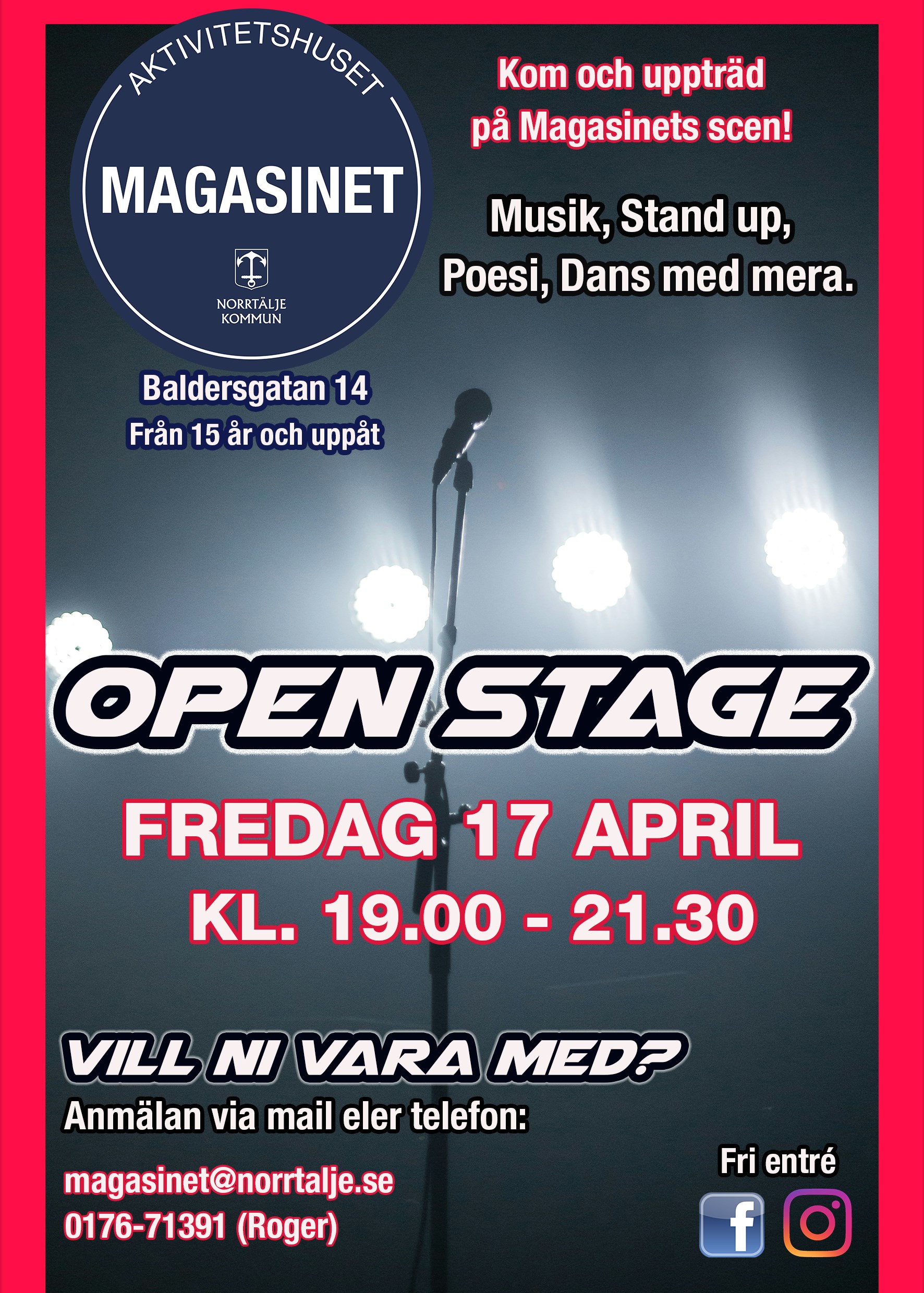 Den 17 April går Magasinets Open Stage än en gång av stapeln. Kom och uppträd med scenkonst av alla slag. Spelar du i band, trubadurar, skriver poesi eller kör stand-up? Oavsett är du välkommen till Aktivitetshuset Magasinets öppna scen och uppträd inför publik.