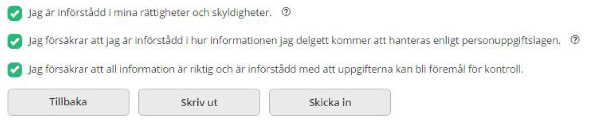 - I din ansökan godkänner du att handläggaren får kontrollera dina uppgifter. Om vi behöver kontrollera uppgifter i din ansökan får du ett meddelande. Var därför noga med att följa ditt ärende när du har lämnat in ansökan.